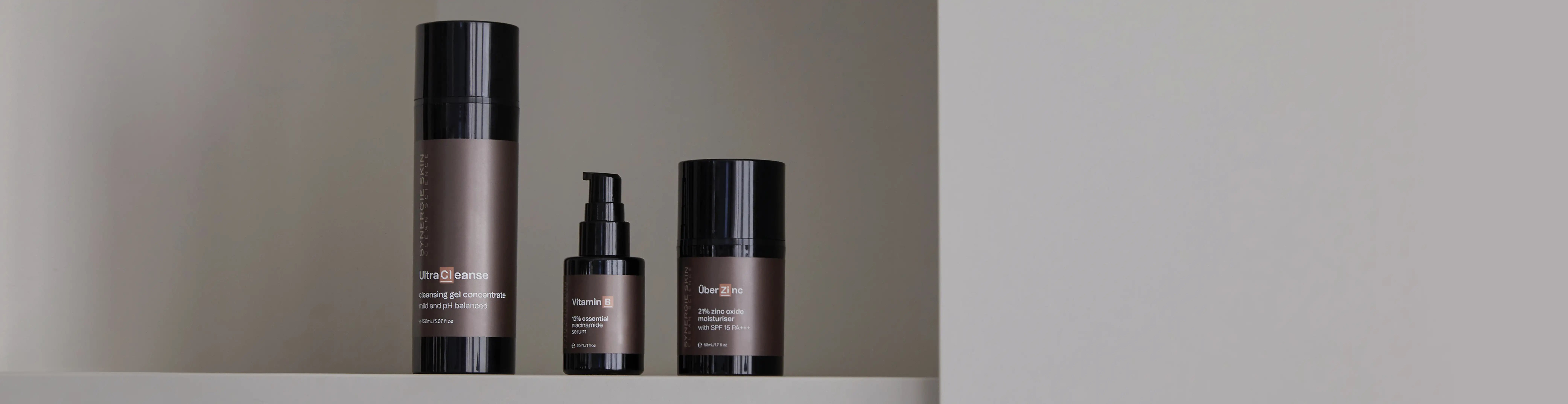 Synergie Skin’s products thrive on efficacy and potency. When selecting products, consider your skin's unique needs and align with ingredients that will expertly cater to those requirements. Our best-seller range includes ingredients such as Niacinamide (Vitamin B3) in our Vitamin B serum and Zinc Oxide in ÜberZinc, which are powerful allies for your skin, fostering protection, rejuvenation, and general skin health.