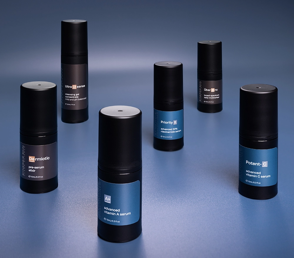 The Advanced Essentials Kit is available exclusively through Synergie Practitioner clinics. This six-piece trial kit features practitioner-strength serums A+, Priority B and Potent-C, plus UltraCleanse, Dermiotic and ÜberZinc. Together, they deliver a complete routine to cleanse, balance, renew and protect — supporting clarity, resilience and long-term skin health under expert guidance.